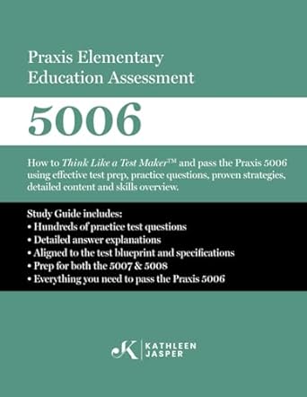 Think Like a Test Makerand pass your Praxis Elementary Assessment 5006 exam. In this study guide, Kathleen Jasper, Ed.D. walks you through all the skills and concepts tested on the Praxis 5006, so you can pass your exam with ease. This study guide is fully aligned with the blueprint and test specifications of the exam.